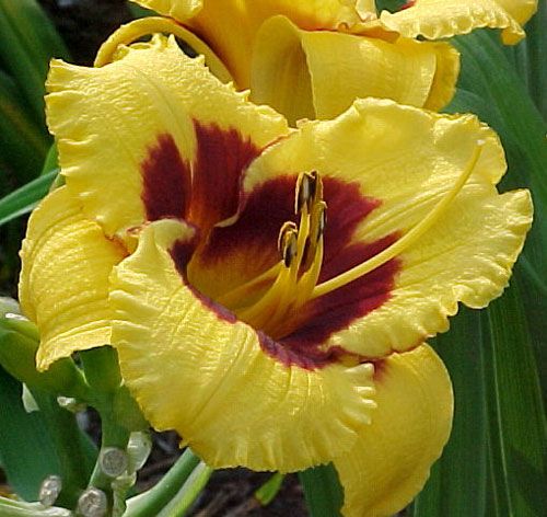 Лилейник Blackberry Candy (Блэкберри Кэнди) представляет собой гибридный сорт с яркими золотисто-желтыми цветками, украшенными насыщенным вишневым глазком и желтым горлом. Лепестки этого сорта слегка гофрированные и отогнутые, что придает цветку особую изысканность.